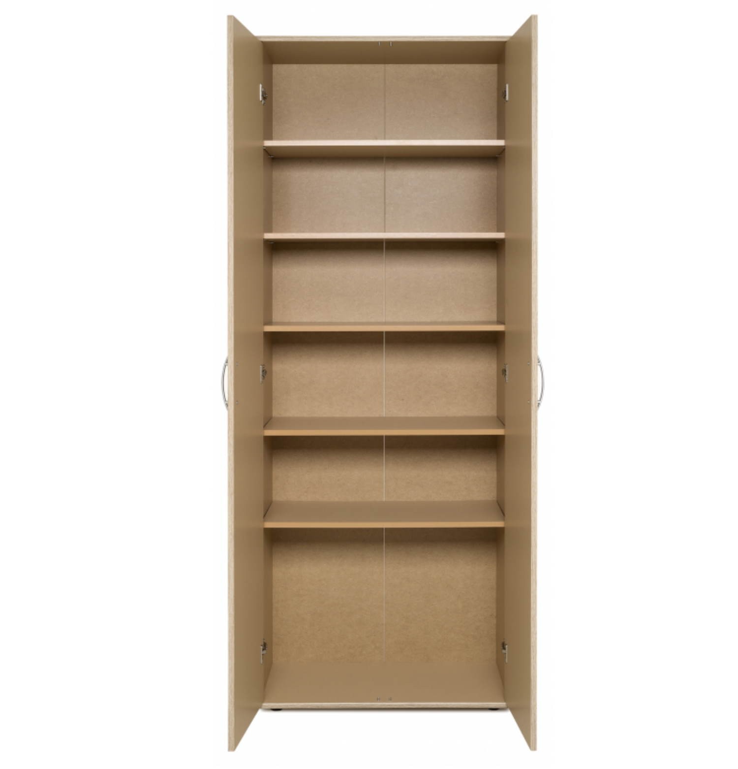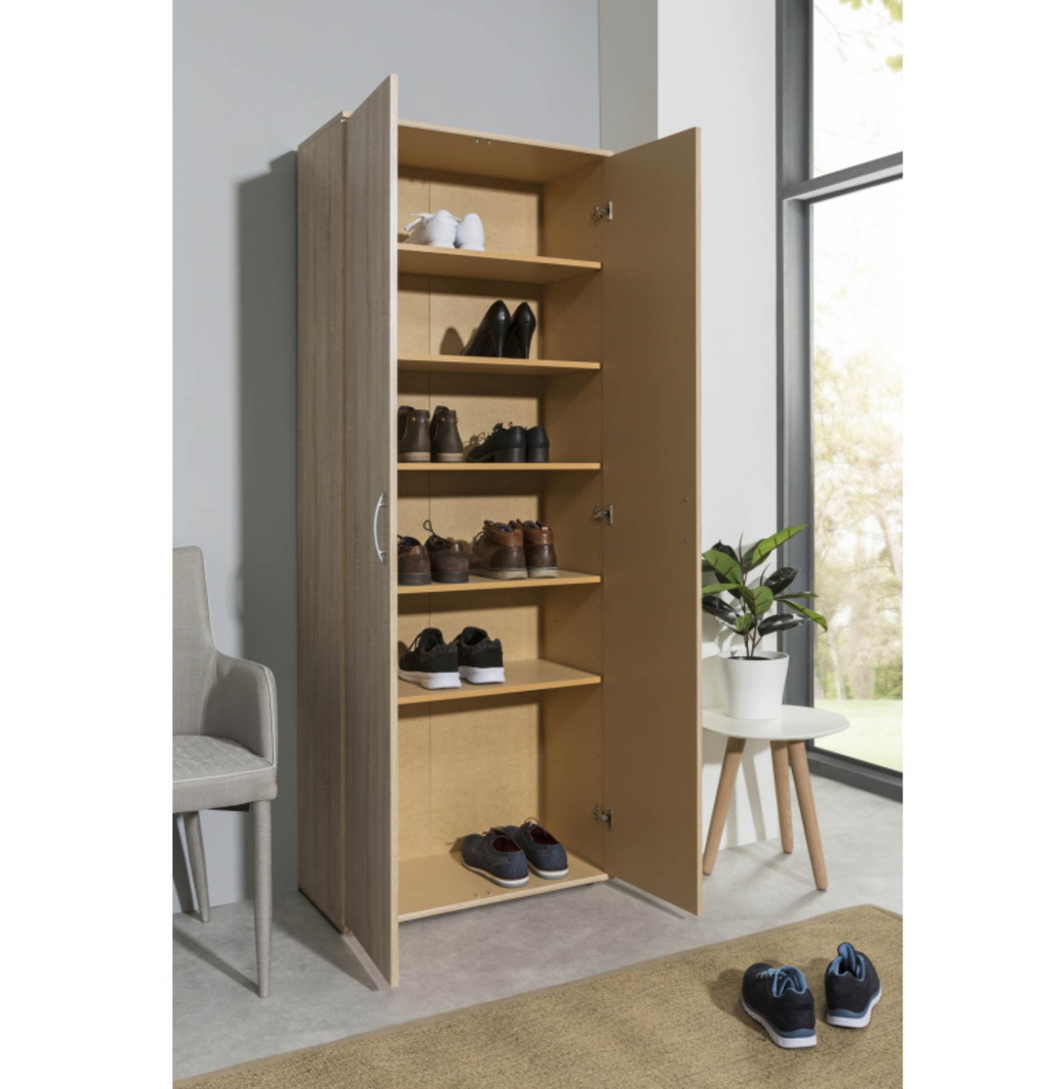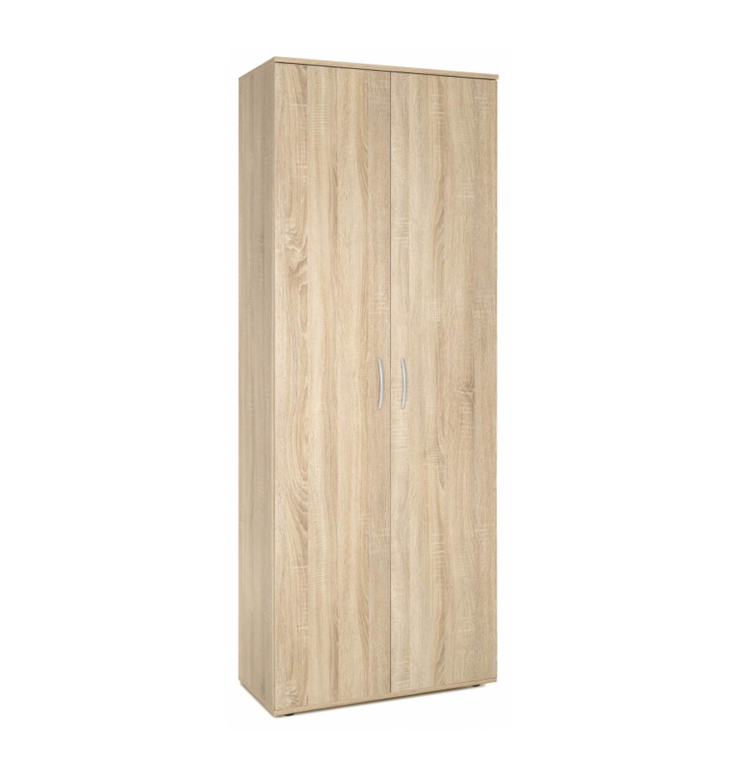 Pratico armadio multiuso, dotato di due ante battenti e ben 5 ripiani dove riporre scarpe, coperte, provviste a seconda dell’utilizzo. Maniglie in plastica colore argento e il colore rovere sonoma lo rendono facilmente abbinabile a ogni ambiente.