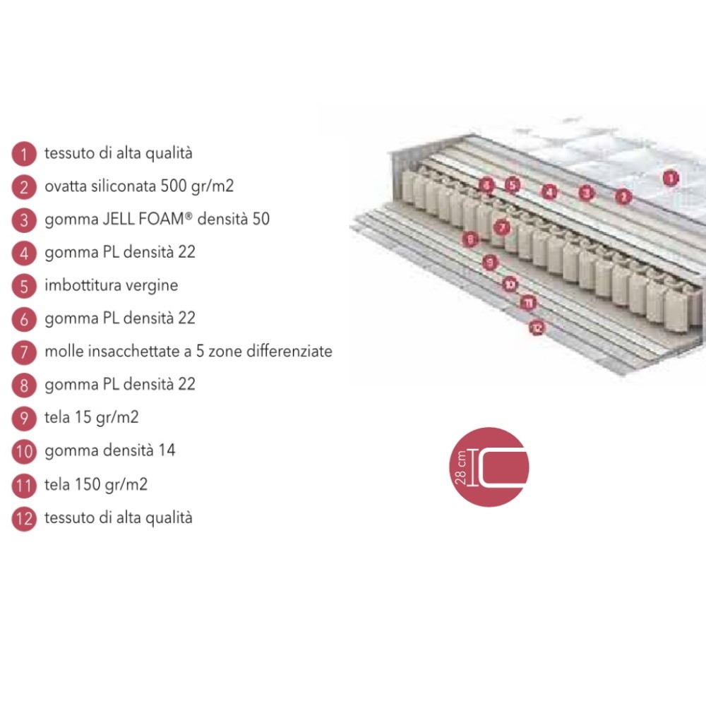 Materasso costruito a mano, con molle insacchettate 5 zone differenziate.