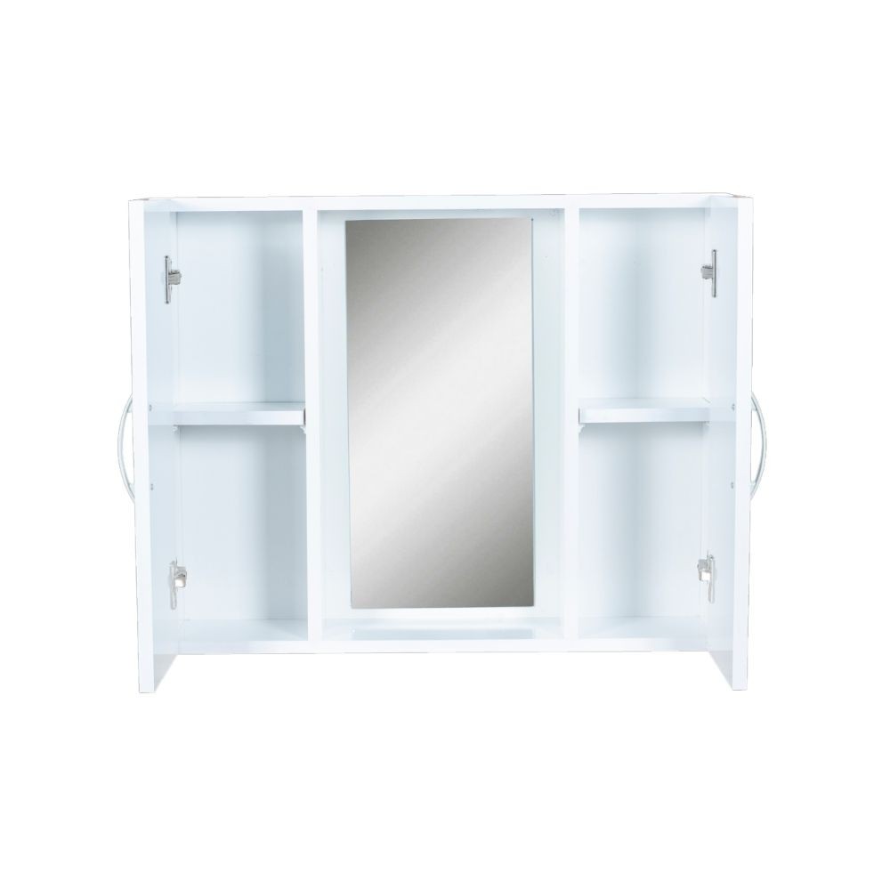 Mobile bagno bianco, composto da specchio due ante con ripiani.
