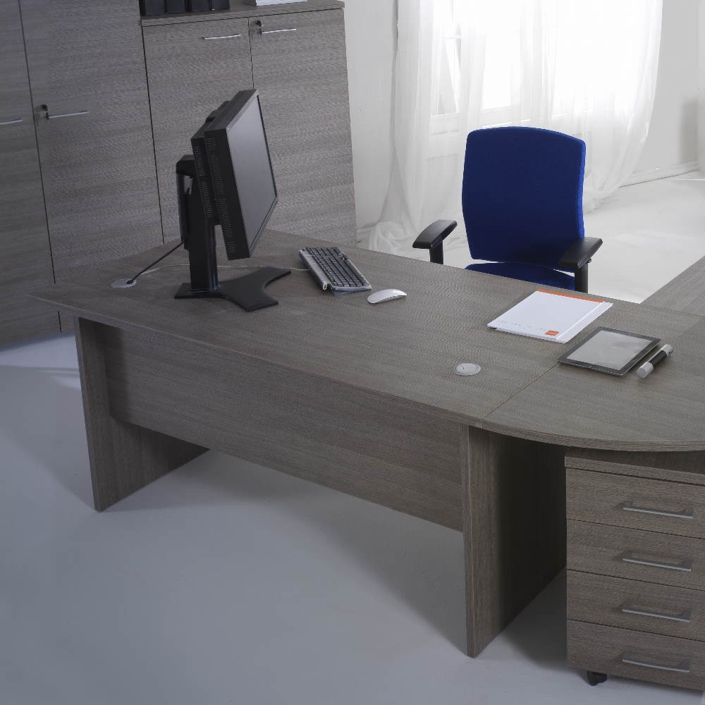 Scrivania pannellata, top in nobilitato melaminico antimacchia, antigraffio, spessore piano 2,5cm., bordi perimetrali con abs.
