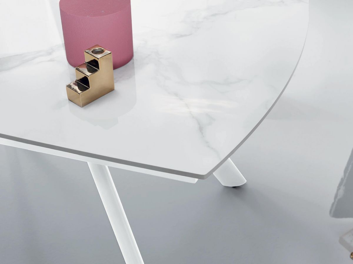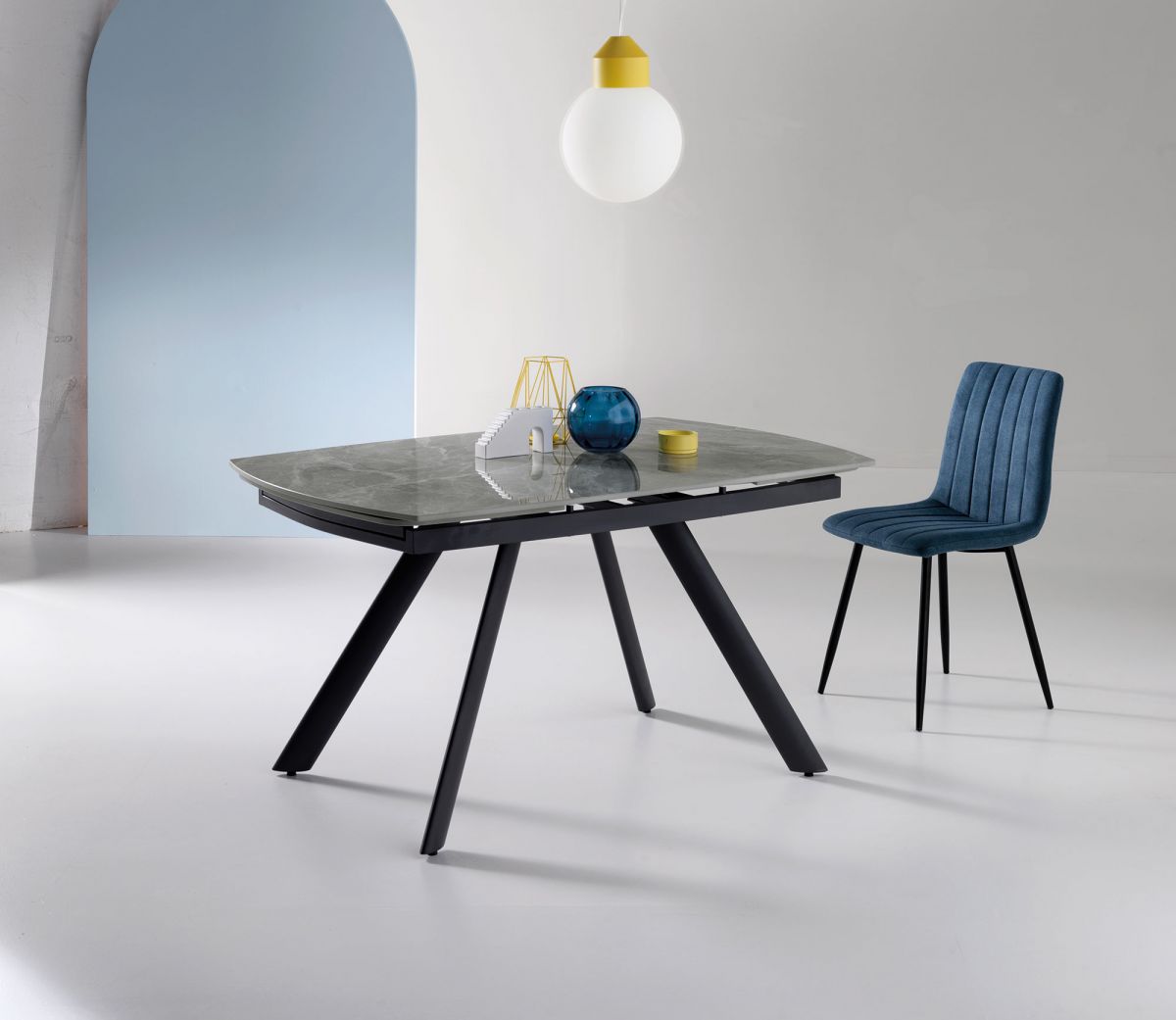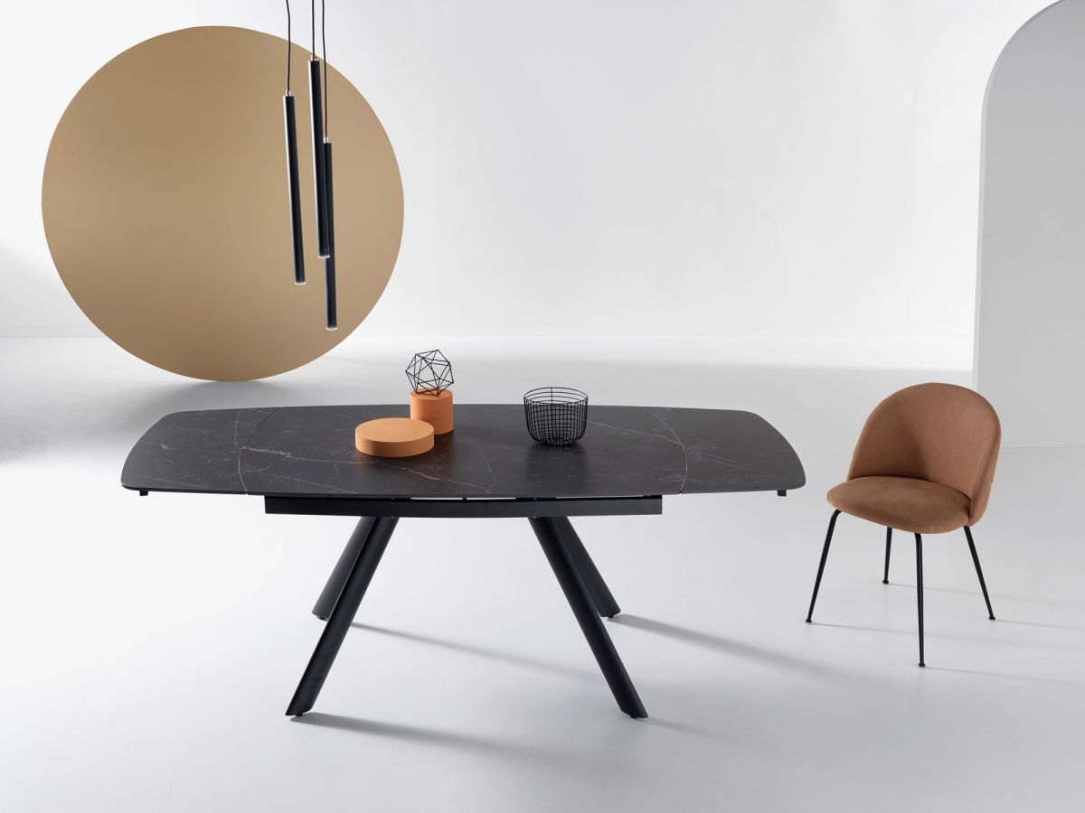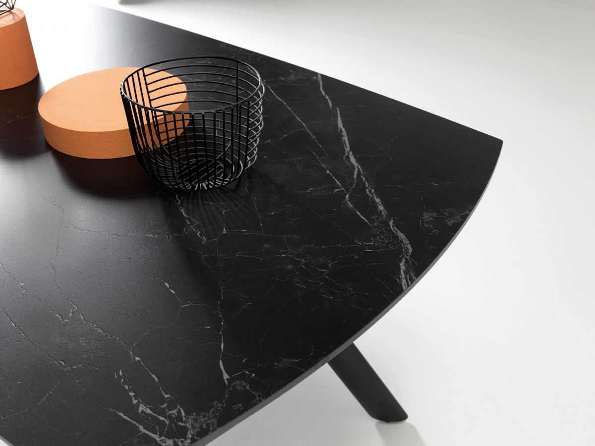 Tavolo modello Terence rettangolare allungabile con due allunghe da 35 cm; base in metallo verniciato e piano in pietra sinterizzata effetto marmo.