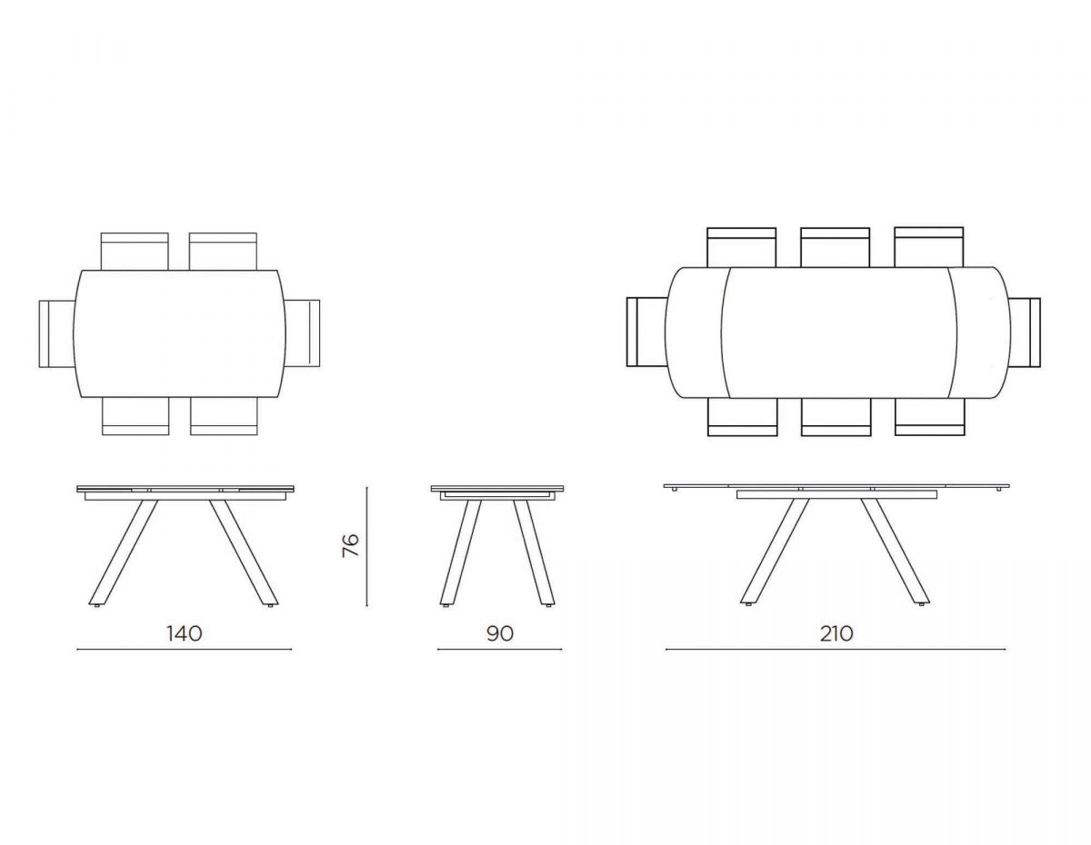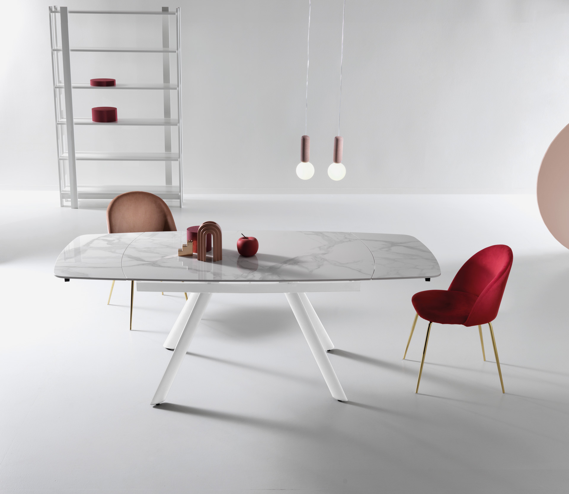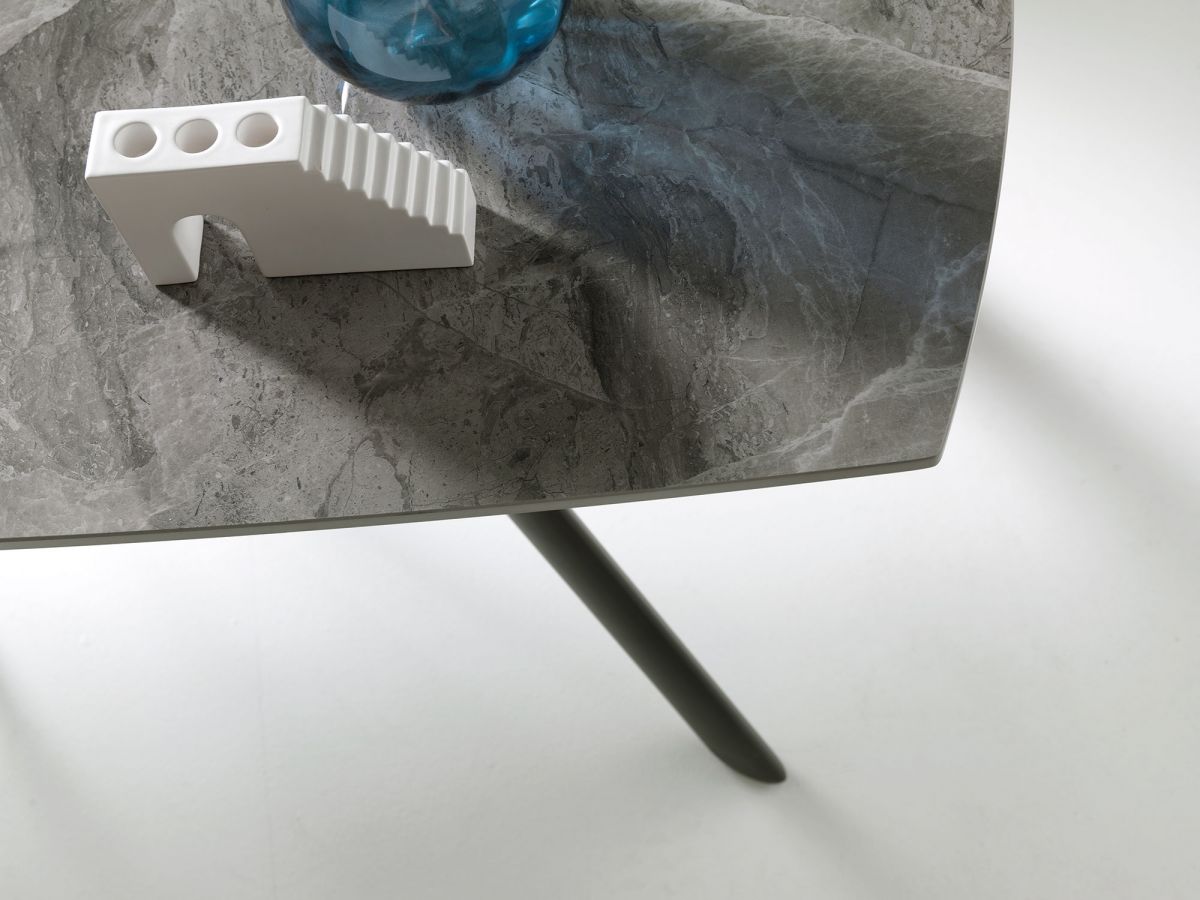 Tavolo modello Terence rettangolare allungabile con due allunghe da 35 cm; base in metallo verniciato e piano in pietra sinterizzata effetto marmo.